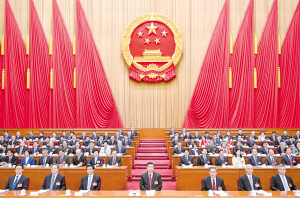人民大会堂大礼堂气氛隆重热烈,主席台帷幕正中的国徽在鲜艳的红旗映衬下熠熠生辉。