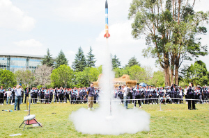 讲座结束后,火箭研制专家杨敬贤为学生讲解火箭制造及飞行原理。“5、4、3、2、1,发射!”在专家的带领下,学生动手制作火箭模型,并在广场成功模拟火箭发射。