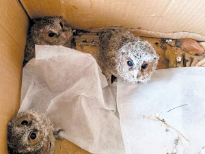 | 3只猫头鹰幼崽被安全移交到野生动物救助站。 禄劝县警方供图 |