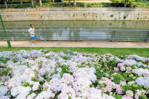 近日,在盘江西路霖雨桥附近绿化带里,一大片绣球花开得灿烂,一簇簇、一团团,形状丰满。娇艳的红、纯净的蓝、清新的粉、素雅的白、神秘的紫,五彩缤纷的绣球花形成一片梦幻花海,点缀着夏日的绚烂。