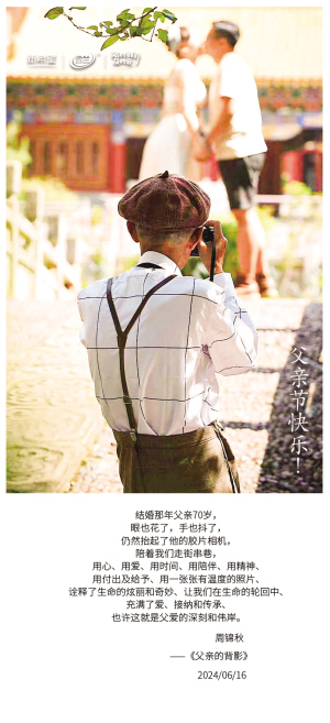 | 结婚那年父亲70岁, 眼也花了,手也抖了, 仍然抬起了他的胶片相机, 陪着我们走街串巷, 用心、用爱、用时间、用陪伴、用精神、 用付出及给予、用一张张有温度的照片、 诠释了生命的炫丽和奇妙、让我们在生命的轮回中、 充满了爱、接纳和传承、 也许这就是父爱的深刻和伟岸。 周锦秋 ——《父亲的背影》 2024/06/16 |