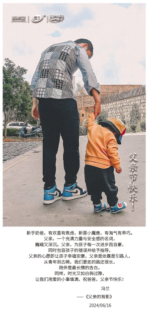 | 新手奶爸,有欢喜有焦虑,新晋小魔兽,有淘气有乖巧。 父亲,一个充满力量与安全感的名词, 巍峨又深沉。父亲,为孩子每一次进步而自豪, 同时包容孩子的错误并给予指导, 父亲的心愿即让孩子幸福安康,父亲是依靠是引路人, 从青年到古稀,我们要走的路还很长, 陪伴是最长情的告白, 同样,时光又如白驹过隙, 让我们用爱的小事填满,祝爸爸,父亲节快乐! 冯兰 ——《父亲的背影 》 2024/06/16 |