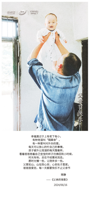 | 幸福莫过于上有老下有小, 有种宠溺叫“隔辈亲”, 有一种爱叫对外孙的爱。 每天可以放心的忙自己的事情, 孩子被外公宠溺的每天围着转, 看着爸爸抱着自己宝宝的样子仿佛回到小时候, 时光匆匆,总在不经意间流走。 愿时光慢一些,让陪伴多一些。 父爱如山,山在则心安,心安处才是家。 爸爸我爱您,每一天都要快乐不止父亲节。 蒋静 ——《父亲的背影》 2024/06/16 |