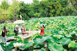 在市中心翠湖,暗香浮动的荷花、亭亭玉立的睡莲、翠绿欲滴的王莲以及园内丰富多彩的活动,每天都吸引着各地游客拍照打卡。翠湖公园第十二届荷花展从7月持续到8月,让游客近距离观赏荷花,体会“误入藕花深处”的意境。花展期间还同步举办戏剧艺术节,为增添趣味性,还在龙云戏台、西南岛及公园大门等区域,开展文化巡游、快闪互动、即兴展示等精彩活动,表演《即乐世界 即兴喜剧》《云尚声相声》《云南少数民族非遗歌舞——咕咕噻噻》等节目,让游客更加深入地了解和品味翠湖。