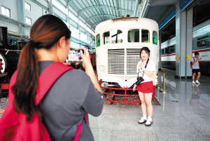 | 一名大学生与“镇馆之宝”“米其林”内燃动车组合影。 |