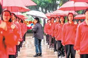 | 张桂梅拿着新的小喇叭,陪伴学生们做课间操。 |