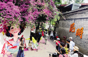 翠湖边黄公东街一株树龄近百年的三角梅爬在墙头,虬枝蜿蜒,绽放出大簇玫红花朵,成为墙绘“锦鲤少女”的花冠,引得游人前来打卡拍照。