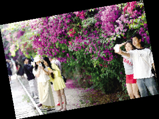 | 宜良三角梅文化节上身穿汉服的女孩与花争艳。 |