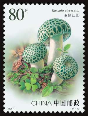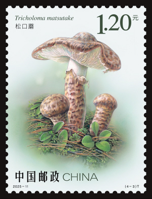 第一枚“变绿红菇”,俗称青头菌,邮票设计突出变绿红菇青翠欲滴的色泽并融入森林生态背景,使整体形象兼具自然野趣与美学韵味。第二枚“中华金耳”,简称金耳,为2024年科研确认的新种,邮票采用博物画风格,还原金耳独特的皱纹与柔韧的果冻状质地。第三枚“松口蘑”,俗称松茸,为我国二级濒危保护物种,邮票刻画了松口蘑菌盖表面的细微纹理及菌柄的粗壮形态,并在背景加入松林元素,增强画面的自然氛围。第四枚“干巴菌”,又称干巴革菌,为我国特有品种,邮票以精细入微的线条勾勒干巴菌丛生分枝的复杂结构,辅以简洁柔和的背景突出主体,再现了其鲜活之态。