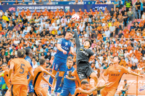 | 图为云南玉昆队守门员余鉴贤(右)在比赛中救球。 新华社 |