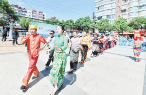 | 每年4月,桃源社区各民族同胞都会欢聚在桃源广场共同参加泼水节活动。 记者王俊星摄 |