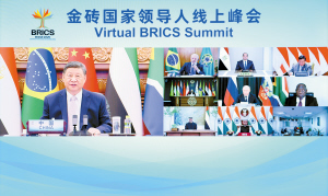 | 9月8日晚,国家主席习近平出席金砖国家领导人线上峰会,并发表题为《团结合作 砥砺前行》的重要讲话。 新华社 |