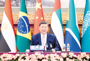 习近平指出,当前,世界百年变局加速演进,霸权主义、单边主义、保护主义甚嚣尘上。金砖国家作为全球南方第一方阵,要坚持弘扬开放包容、合作共赢的金砖精神,共同捍卫多边主义,维护多边贸易体制,推进“大金砖合作”,携手构建人类命运共同体。