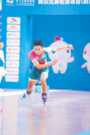 图为云南省轮滑代表队运动员李佳瑞在自由式速度过桩项目中夺金。