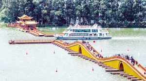 | 2025年10月1日,一艘游船通过位于滇池草海的东风坝开合浮桥(无人机照片)。 新华社 |