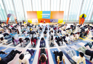 | 第八届进博会消费品展区外拍摄的露露乐蒙主办的百人瑜伽活动。 新华社 |