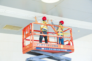 | 环境能源科工作人员王建敏检查车间灯管损坏情况。 |