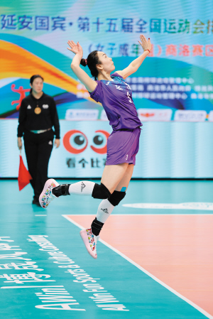 11月18日,十五运会女子排球成年组小组赛,云南队在与中国香港队的比赛中迎来赛点。最后一球,37岁老将刘梦雅在四号位接球高高跃起、一锤定音,帮助云南取得胜利。