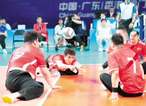 12月12日,在广州举行的全国第十二届残疾人运动会暨第九届特殊奥林匹克运动会坐式排球项目男子组小组赛中,云南队3比0战胜江苏队。 图为云南队球员王硕(左二)在比赛中救球。 新华社