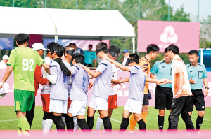12月12日,在盲人足球项目男子组小组赛中,云南队3比2战胜天津队。 图为双方球员在比赛后互相握手致意。 新华社