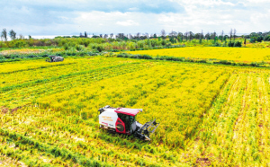 | 收割机在稻田中往来穿梭。记者王俊星摄 |