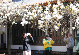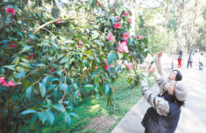 本报讯 记者黄晓松摄影报道 去年下半年昆明雨水充沛,金殿名胜区茶花花期较往年略有提前。目前,金殿前的九心十八瓣玛瑙红山茶、玉兰、贴梗海棠、梅花等正在开放。整个园区里的华东茶、茶梅、云南山茶、连蕊茶等各个类群的1200余种山茶也将次第开放。赏花期从茶花节开幕的1月1日持续至3月下旬,最佳赏花时间在春节前后。
