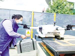 | 工作人员将物品放到无人机上。 |