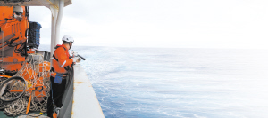 图为“雪龙”号大洋队队员手持发射器,向海中投放抛弃式温深仪。