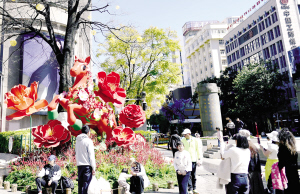 南屏街忠爱坊北侧,运用高山杜鹃、云南山茶等50余种乡土花卉植物,打造主题为“观山·观水·观春城”的大型艺术沉浸式立体花雕;在北京路与白云路交叉口的同德昆明广场,一座名为“赤马迎春”的立体花雕巍然矗立……