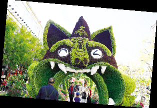 | 南屏街的巨型花艺瓦猫拱门。 记者赵伟摄 |