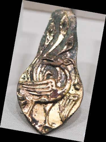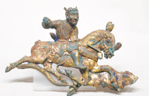 | 西汉时期的鎏金骑士猎鹿铜扣饰。 |