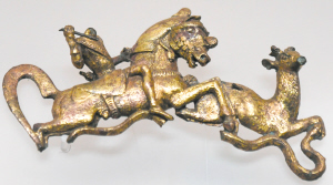| 西汉时期的骑士猎鹿铜扣饰。 |