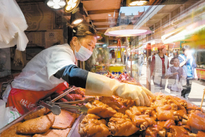 | 一名摊主在市场内售卖卤味。 |