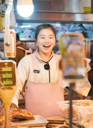 | 一名摊主在市场内通过直播方式售卖鸡肉。 |