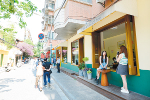 黄公东街两侧多为民国时期的建筑,明艳的鹅黄色墙面与绿色门窗搭配,文艺复古感十足。午后,沿街的咖啡店坐满了客人,打扮时髦的年轻人或围着咖啡桌谈笑、或拍照打卡、或闲坐休息发呆。沿街前行,“人间四月天”艺术字搭配着蓝花楹造型的立体装置格外醒目,周边环绕着鲜花绿植,散落着光萃、北归、竹隐等精品咖啡馆。