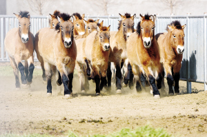 | 2月3日,在甘肃濒危动物保护中心普氏野马饲养繁育基地,一群普氏野马在圈舍内奔跑。新华社 |