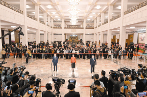 | 3月4日,全国政协十四届四次会议首场“委员通道”集体采访活动在北京人民大会堂举行。 新华社 |