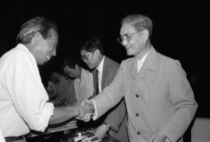 | 1991年6月26日,中共中央组织部、中共中央宣传部等单位在北京召开大会,表彰全国高校优秀思想政治工作者。这是宋平同志(右)向获奖的个人颁奖。 新华社 |