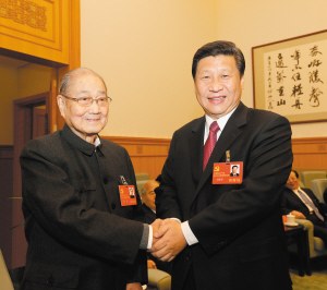 | 2012年11月14日,在党的十八大闭幕前,习近平同志同宋平同志在一起。 新华社 |