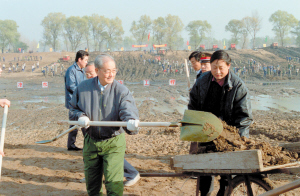| 1991年11月13日,宋平同志(左)来到北京市通县(今通州区)张家湾凉水河整治工程工地参加劳动。 新华社 |