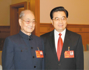| 2007年10月21日,在党的十七大闭幕前,胡锦涛同志同宋平同志在一起。 新华社 |
