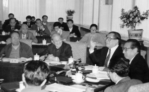 | 1991年4月,江泽民同志、宋平同志(前排左二)等与参加党建理论讨论会的代表座谈。 新华社 |