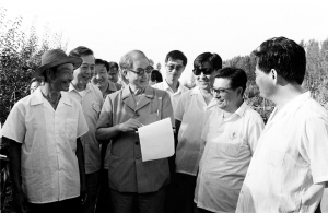 | 1990年7月中下旬,宋平同志(前左二)来到内蒙古自治区巴彦淖尔市临河区马场地村了解基层党支部建设情况。 新华社 |