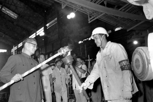 | 1985年9月15日,我国第一座日产万吨铁的高炉——宝钢一号高炉点火试生产。这是宋平同志(左一)为高炉点火。 新华社 |