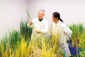 | 韩斌院士(左)和吕丹凤高级工程师在交流水稻植株生长情况。新华社 |