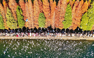 | 游客在滇池畔的海洪湿地公园喂红嘴鸥。新华社 |